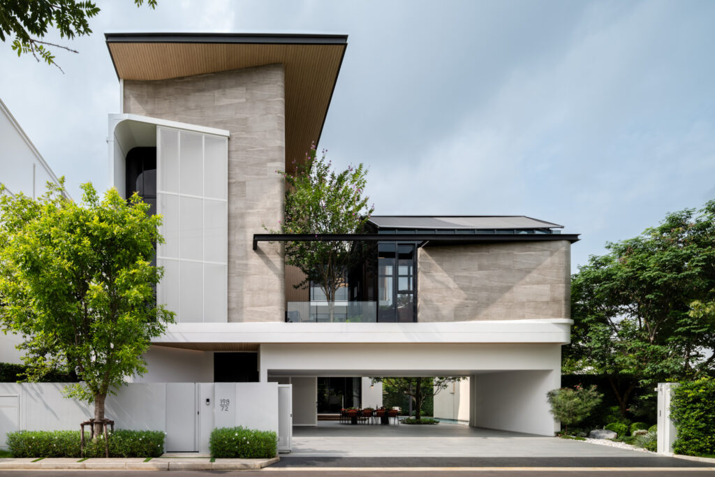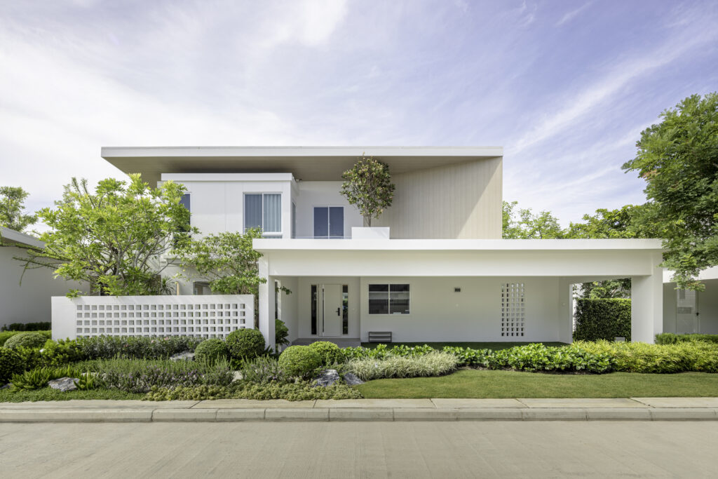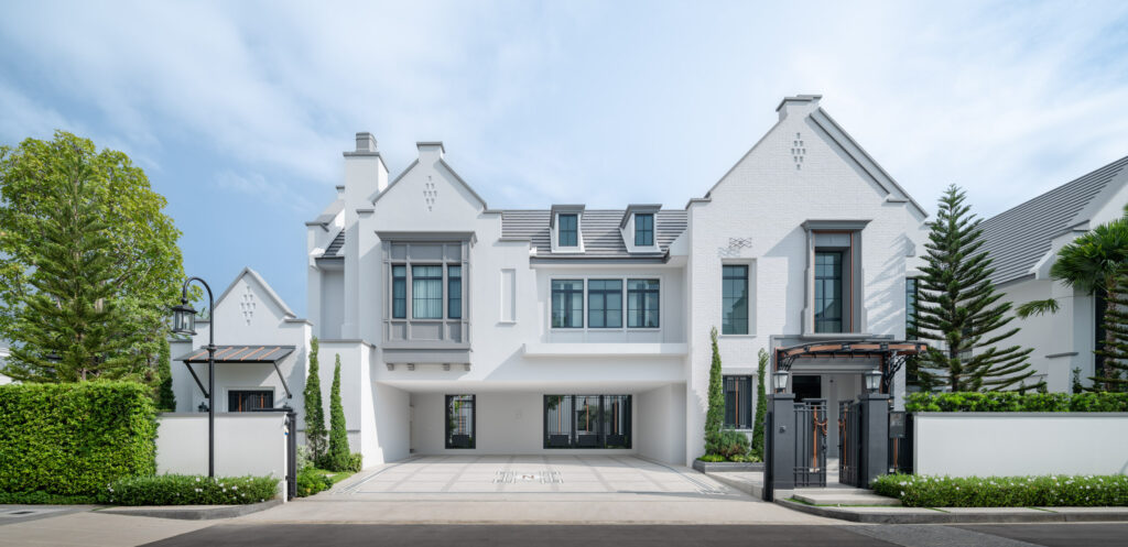 สำหรับ Nantawan Pool Villa พระราม 9 กรุงเทพกรีฑาตัดใหม่ บ้านเดี่ยว 2 ชั้น หน้ากว้าง ทรงจั่ว โดดเด่นด้วยสถาปัตยกรรม Cape Dutch ในสไตล์ French Eclectic Series ผสานโทนสีขาวและเทาอย่างกลมกลืน สะท้อนความเรียบหรูและรายละเอียดทางสถาปัตยกรรมอย่างมีมิติ