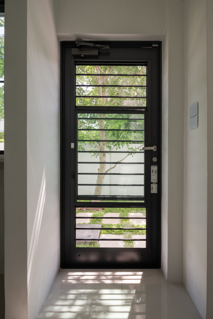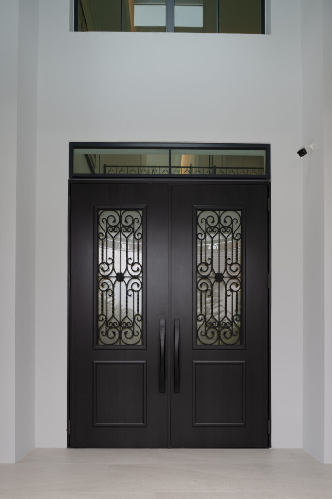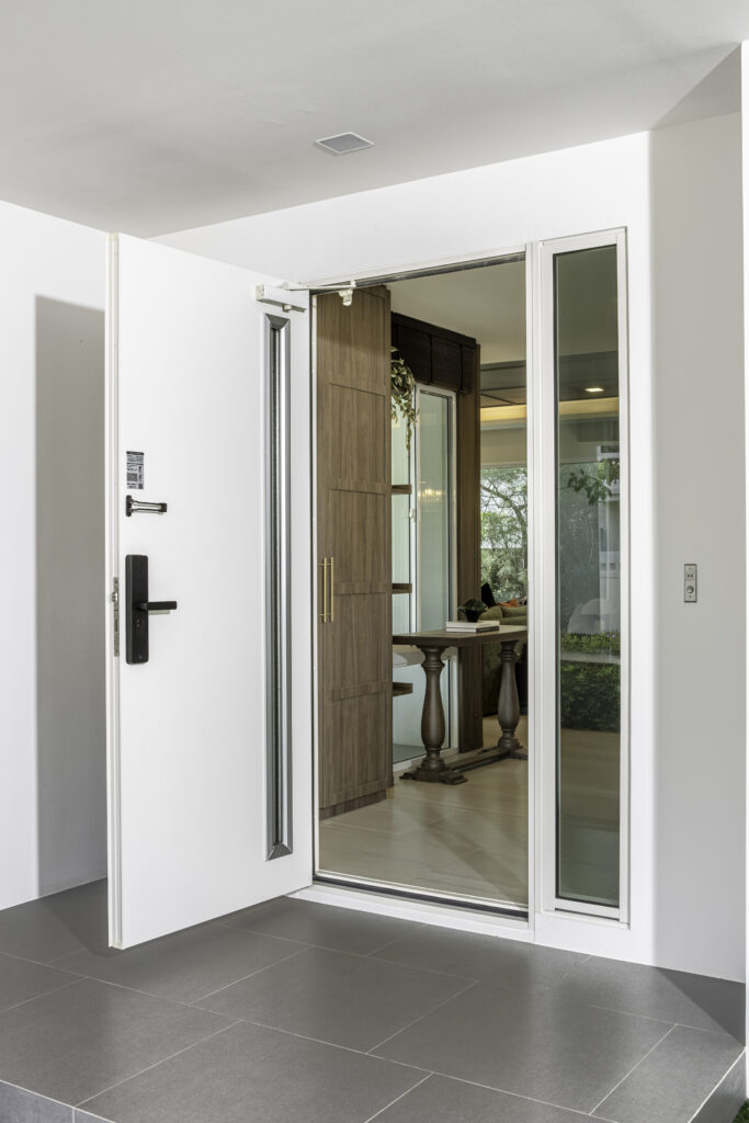 นอกจากนี้ประตูทางเข้า ทางโครงการเลือกใช้ ประตู GIESTA รุ่น G01 จาก TOSTEM บานประตูที่ผลิตจากแผ่นเหล็กเคลือบด้วยเรซิ่นลายไม้คุณภาพสูง ให้กลิ่นอายเหมือนแผ่นไม้จริง กรุด้วยกระจกสั่งพิเศษและตกแต่งด้วยคิ้วลายไม้ รวมถึงมีดีเทลเหล็กดัดที่เพิ่มรายละเอียดให้กับบานประตูได้อย่างสวยงาม พร้อมมือจับดิจิทัล FamiLock มอบความสะดวก ปลอดภัย และความหรูหราตั้งแต่ก้าวแรกเข้าสู่บ้าน ส่วนพื้นที่ครัวติดตั้ง Airflow Door จาก TOSTEM ช่วยระบายอากาศได้ 3 ระดับ พร้อมมุ้งลวดในตัว ทำให้ทุกพื้นที่ภายในบ้านโปร่ง โล่ง และใช้งานได้เต็มที่โดยไม่ต้องกังวล