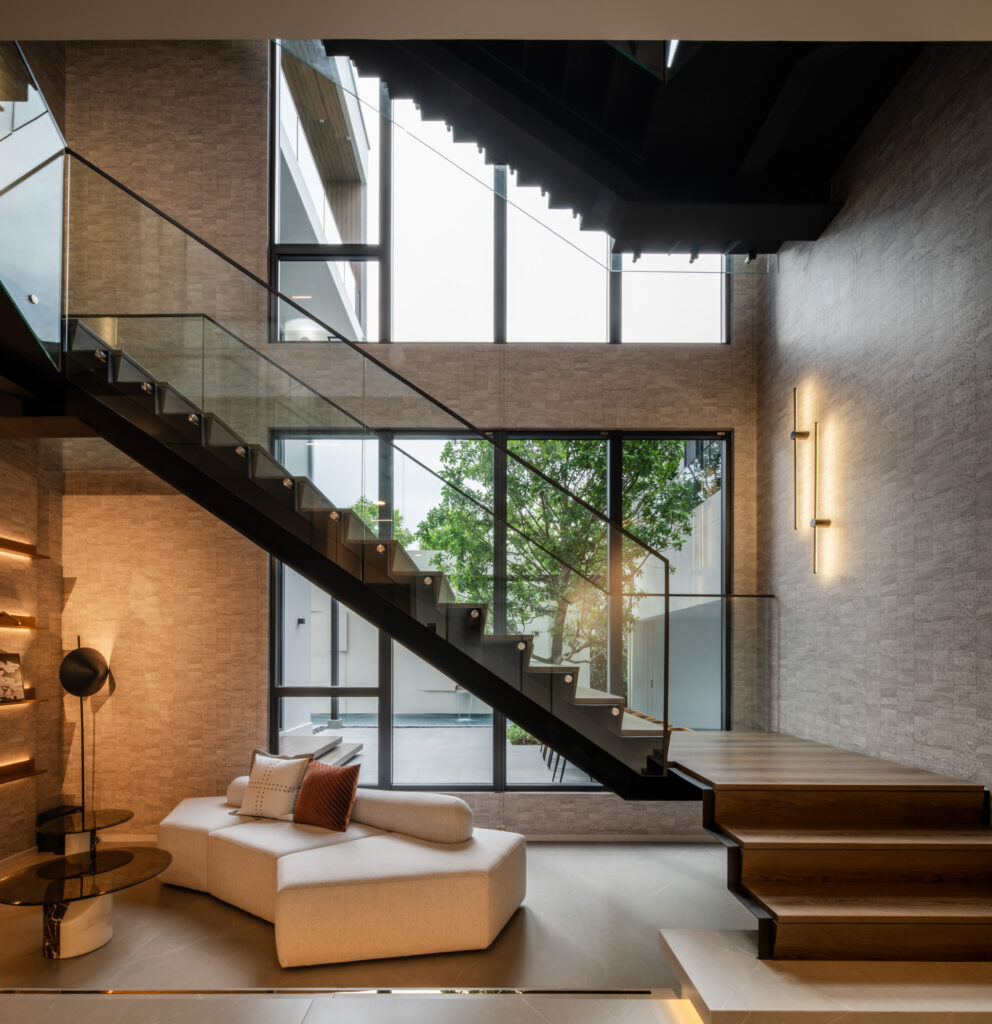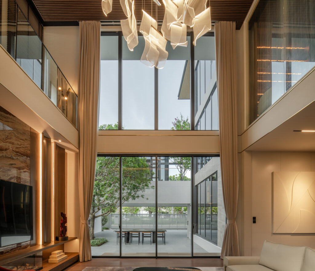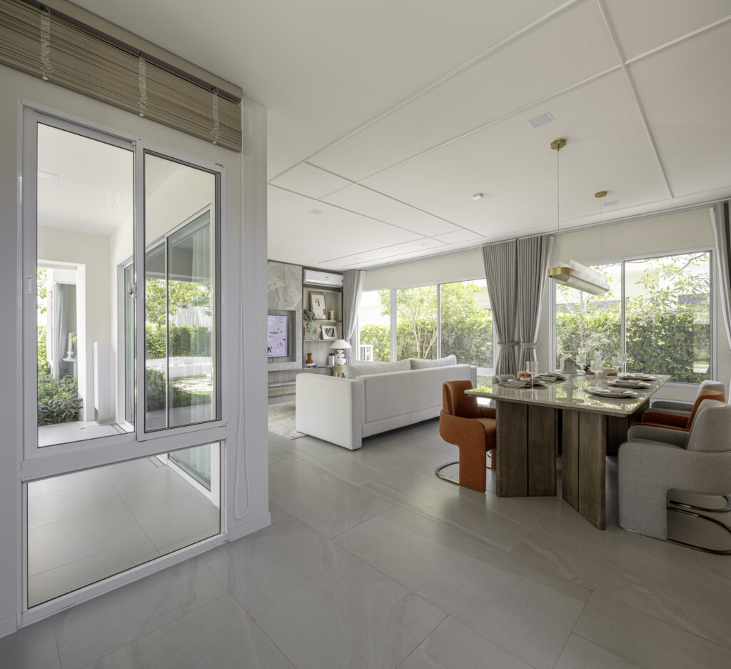 เพื่อเติมเต็มศิลป์แห่งชีวิต ทางโครงการเลือกใช้ ประตูหน้าต่าง TOSTEM ตลอดทั้งหลัง พร้อมออกแบบให้ทุกมุมมองเปิดกว้างและเชื่อมต่อกันอย่างเป็นธรรมชาติ ผ่าน Double Volume สูงถึง 6.9 เมตร ที่สร้างความรู้สึกโปร่งโล่ง มีลำดับชั้นและจังหวะของสเปซอย่างลงตัว พร้อม Double View มุมมองสองฝั่งที่สมดุล เพิ่มความโอ่อ่าและการเชื่อมต่อระหว่างพื้นที่ ทำให้ผู้อยู่อาศัยสัมผัสสัดส่วน สเปซ และแสงธรรมชาติได้เต็มที่