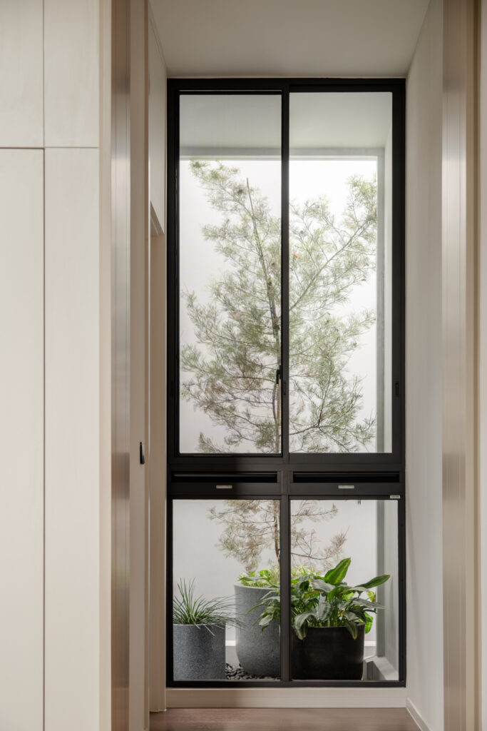 การเลือกใช้ระบบหน้าต่างและประตู TOSTEM ทั้งหลัง เช่น รุ่น GIESTA (P01) สี Turin Pine, WE70 Airflow Door & Airflow Slot, GRANTS, WE Plus และ ATIS สี Dusk Gray ทำให้ทุกบานหน้าต่างไม่ใช่แค่ส่วนประกอบของบ้าน แต่กลายเป็นเครื่องมือออกแบบที่เชื่อมโยงสเปซ มิติ และชีวิตประจำวัน ให้บ้านโปร่ง โล่ง และมีชีวิตชีวาในทุกมุมมอง