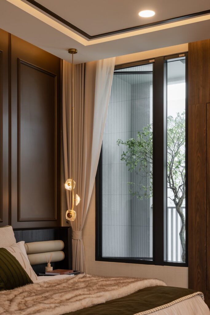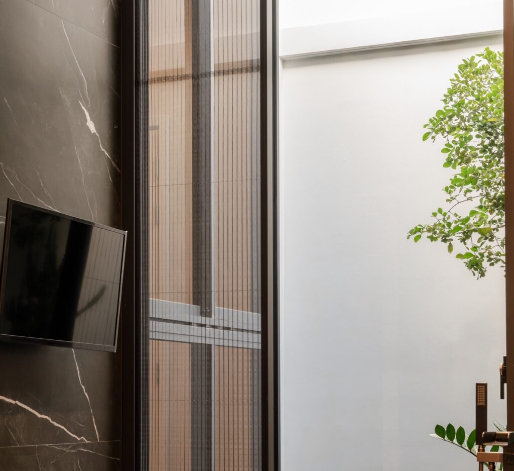 มุ้งจีบได้รับการออกแบบให้ผสานเป็นส่วนหนึ่งของวงกบประตูหน้าต่างอย่างแนบเนียน โดยไม่ต้องใช้รางเสริม จึงช่วยรักษาเส้นสายสถาปัตยกรรมให้เรียบและไม่รบกวนมุมมอง เมื่อเลื่อนปิด–เปิด การทำงานเป็นไปอย่างต่อเนื่องและเมื่อไม่ใช้งานสามารถเลื่อนเก็บได้อย่างเป็นระเบียบ ส่งผลให้พื้นที่โดยรวมดูมินิมอล โปร่งเบา ตอบรับกับงานดีไซน์สมัยใหม่ได้อย่างสมบูรณ์