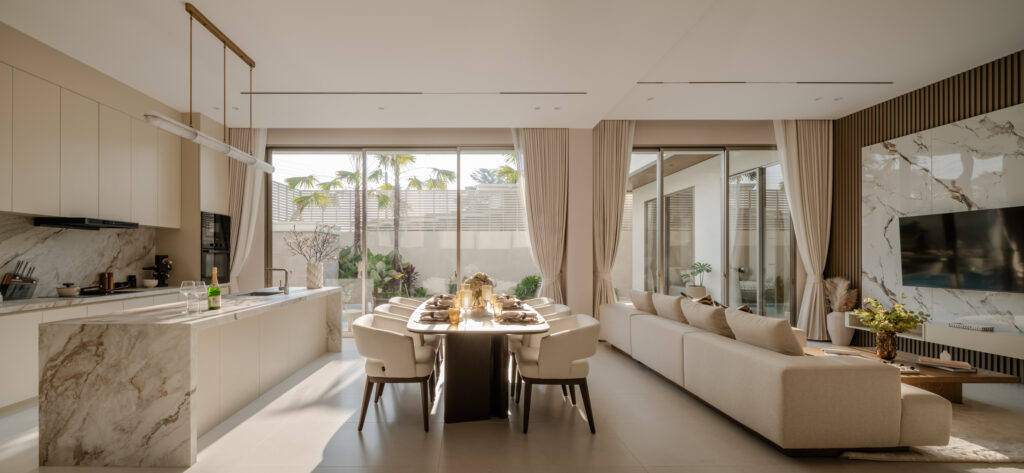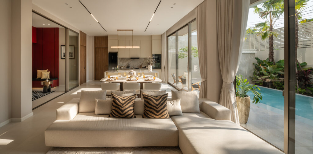 แนวคิดบ้านร่วมสมัยของ CHARIN ไม่ได้หยุดอยู่ที่ภาพลักษณ์ แต่สะท้อนผ่านการจัดวางสเปซและ Flow การใช้งานอย่างตั้งใจ ห้องนั่งเล่นที่เปิดรับแสงธรรมชาติเต็มที่ เพดานสูง 3.2 เมตรที่สร้างความโปร่งสบาย และการออกแบบให้พื้นที่ Indoor–Outdoor เชื่อมต่อกันอย่างลื่นไหล ทำให้บ้านทั้งหลังมีจังหวะการใช้งานที่ต่อเนื่อง ไม่ถูกตัดขาดเป็นส่วน ๆ