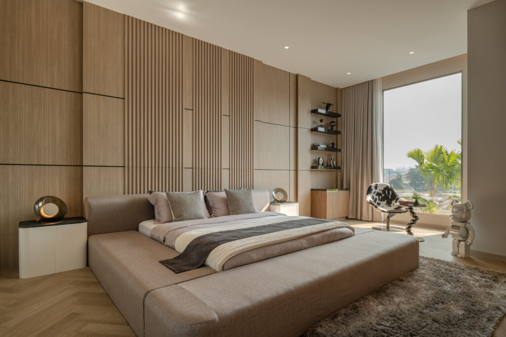 พื้นที่ส่วนตัวนี้ถูกออกแบบให้แยกขาดจากจังหวะชีวิตในชั้นล่างอย่างชัดเจน ทั้งห้องนอน ห้องแต่งตัว His & Her ห้องฟิตเนส ห้องนั่งเล่นส่วนตัว ไปจนถึงระเบียงที่เปิดรับมุมมองรอบด้าน เพดานสูง 3.20 เมตรช่วยขยายมิติของพื้นที่ให้โปร่ง โล่ง และให้ความรู้สึกถึงการพักผ่อนที่สะดวกสบาย ทั้งในเชิงกายภาพและอารมณ์ ขณะเดียวกันยังคงความเป็นบ้านเดี่ยวที่เชื่อมโยงกับธรรมชาติรอบตัวอย่างแนบเนียน