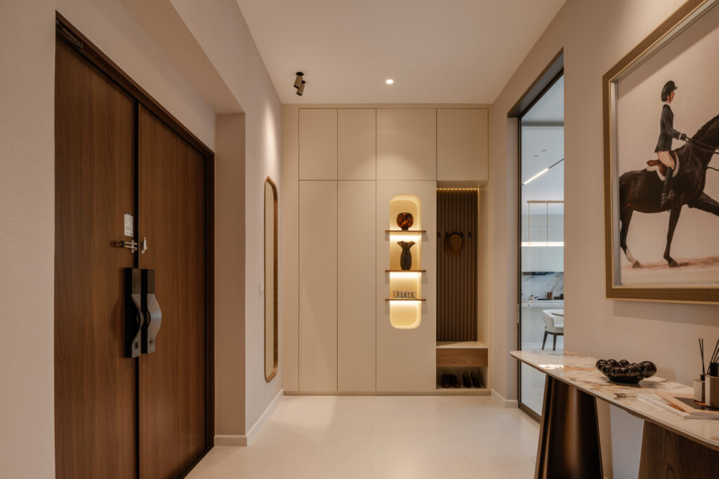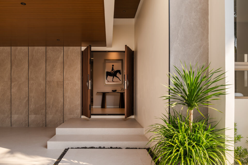 ประสบการณ์ของการเปิดรับเริ่มต้นตั้งแต่ก้าวแรก ผ่านทางเข้าหลักที่เลือกใช้ประตู TOSTEM รุ่น GIESTA ประตูทางเข้าที่ไม่ได้ทำหน้าที่เพียงแบ่งขอบเขตระหว่างภายนอกและภายใน แต่ช่วยกำหนดบรรยากาศของบ้านตั้งแต่แรกสัมผัส ด้วยดีไซน์ที่เรียบ เนี้ยบ และสัดส่วนที่สง่างาม เปิดรับแสงอย่างพอดี และสร้างความรู้สึกมั่นคง ปลอดภัย ก่อนพาผู้อยู่อาศัยก้าวเข้าสู่พื้นที่ส่วนตัวที่ถูกออกแบบมาอย่างตั้งใจในทุกมิติ