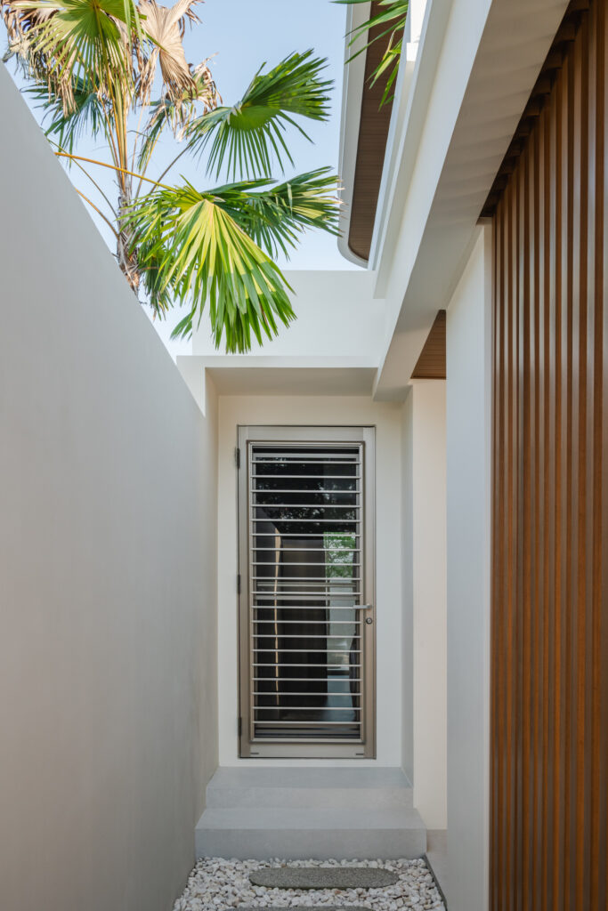 การแยกโซนห้องนั่งเล่นและห้องนอนด้วย Corridor ไม่ได้ช่วยแค่เรื่องเสียงรบกวน แต่ยังส่งผลต่อ การไหลเวียนของอากาศ ภายในบ้าน พื้นที่ถูกจัดจังหวะให้ลมสามารถเคลื่อนผ่านได้อย่างเป็นธรรมชาติ ลดความอับและความร้อนสะสม โดยเฉพาะในบริบทของพัทยาที่สภาพอากาศมีผลกับคุณภาพชีวิตโดยตรง