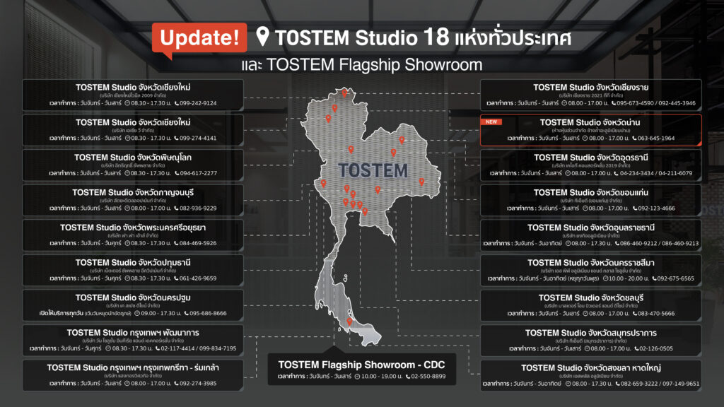 สัมผัสสินค้าคุณภาพจาก TOSTEM กันแบบใกล้ชิด พร้อมรับคำแนะนำจากผู้เชี่ยวชาญ เพื่อเลือกสรรประตูหน้าต่างให้เหมาะกับบ้านของคุณ กับ TOSTEM Studio ทั้ง 18 สาขาทั่วประเทศ และ TOSTEM Flagship Showroom อีก 1 แห่ง มาดูกันว่าแต่ละสาขาอยู่ที่ไหนบ้าง เช็กพิกัดแล้วรีบไปเยี่ยมชมกัน